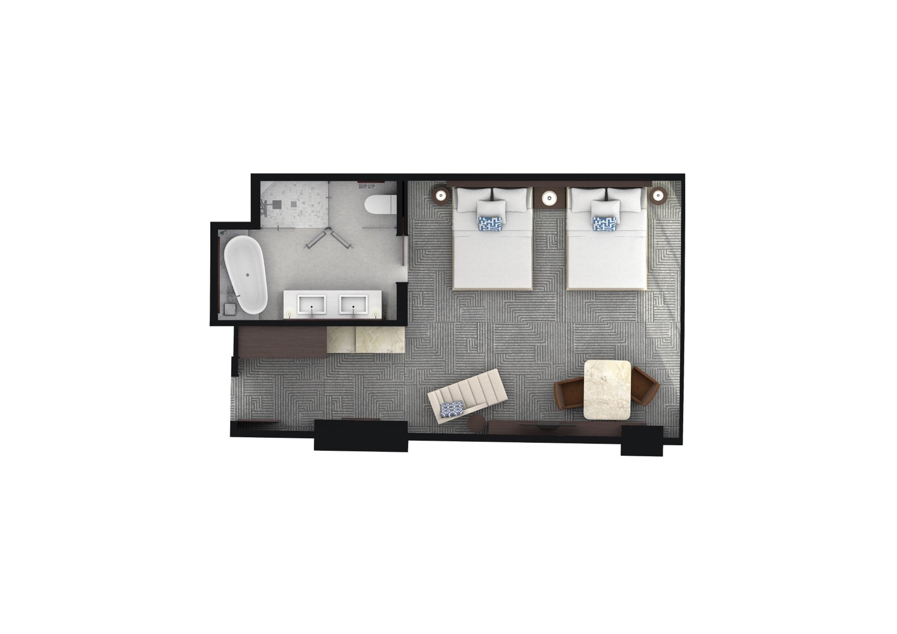 Deluxe Twin Rooms at Crown Towers blend state-of-art technology in a stylish, open plan setting with twin beds, a large work desk and plush chaise lounge. Complimentary high-speed internet access and a host of amenities make this room the perfect environment for work or leisure. This room also features a spacious marble bathroom with deep soaking bath and separate rain shower.